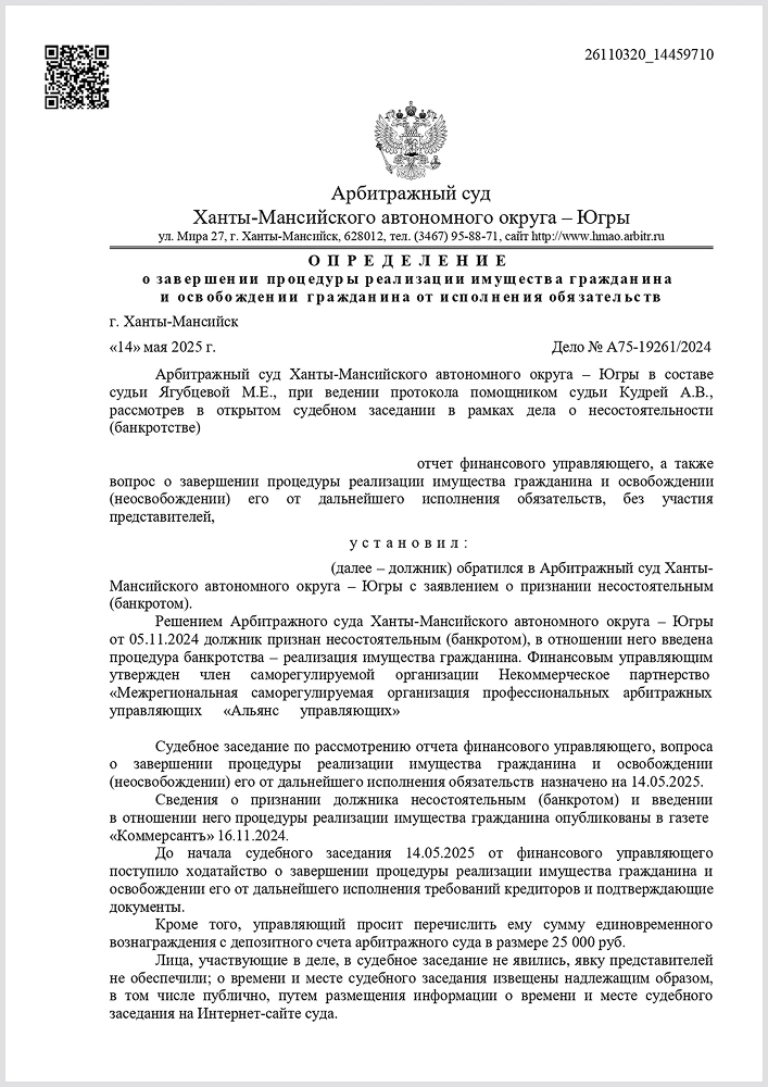 Завершили процедуру банкротства в Арбитражном суде ХМАО-Югры, долг в размере 1,5 млн. руб. списан