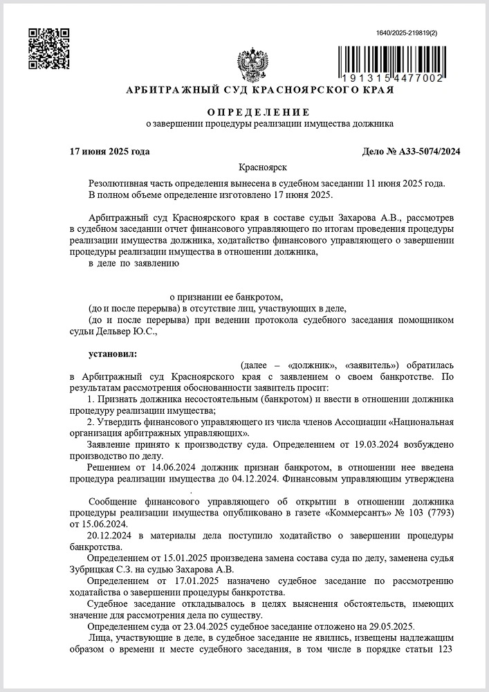 Завершили процедуру банкротства в Арбитражном суде Красноярского края. Долг в сумме 1,5 млн. руб. списан. Кредитор возражал против освобождения нашего клиента от долгов, ссылаясь на его недобросовестность. Мы доказали обратное!