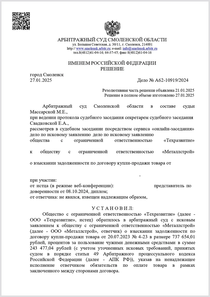 Взыскана задолженность с компании-должника в размере 1,4 млн. руб. для нашего клиента